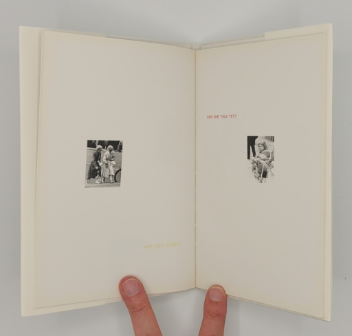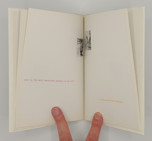 On each page of this artist’s book by Ken Lum, a small black and white photograph of an individual or group of individuals accompanies a corresponding question or “speculation,” printed in one of eight colours. The questions constitute musing about taste, background, race or a number of other subjects, ranging in tone from the incidental to the philosophical. Lum uses the relation between the text and the image to comment on the nature of personal relations. The theme of the project is the issue of private individuality and the depersonalisation of social relations. The project focuses on the language of speculative communication, that is, unspoken thoughts which may remain internalised and unexpressed and therefore, personal and subjective. Ref.1