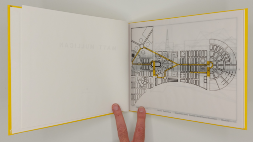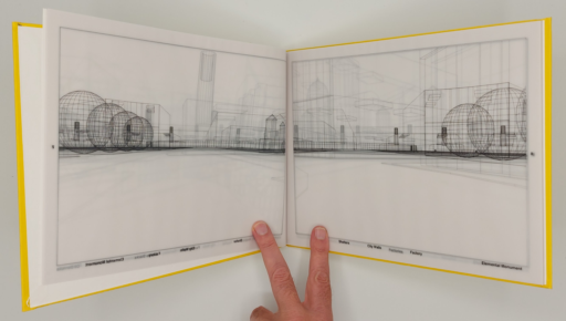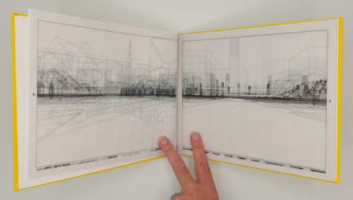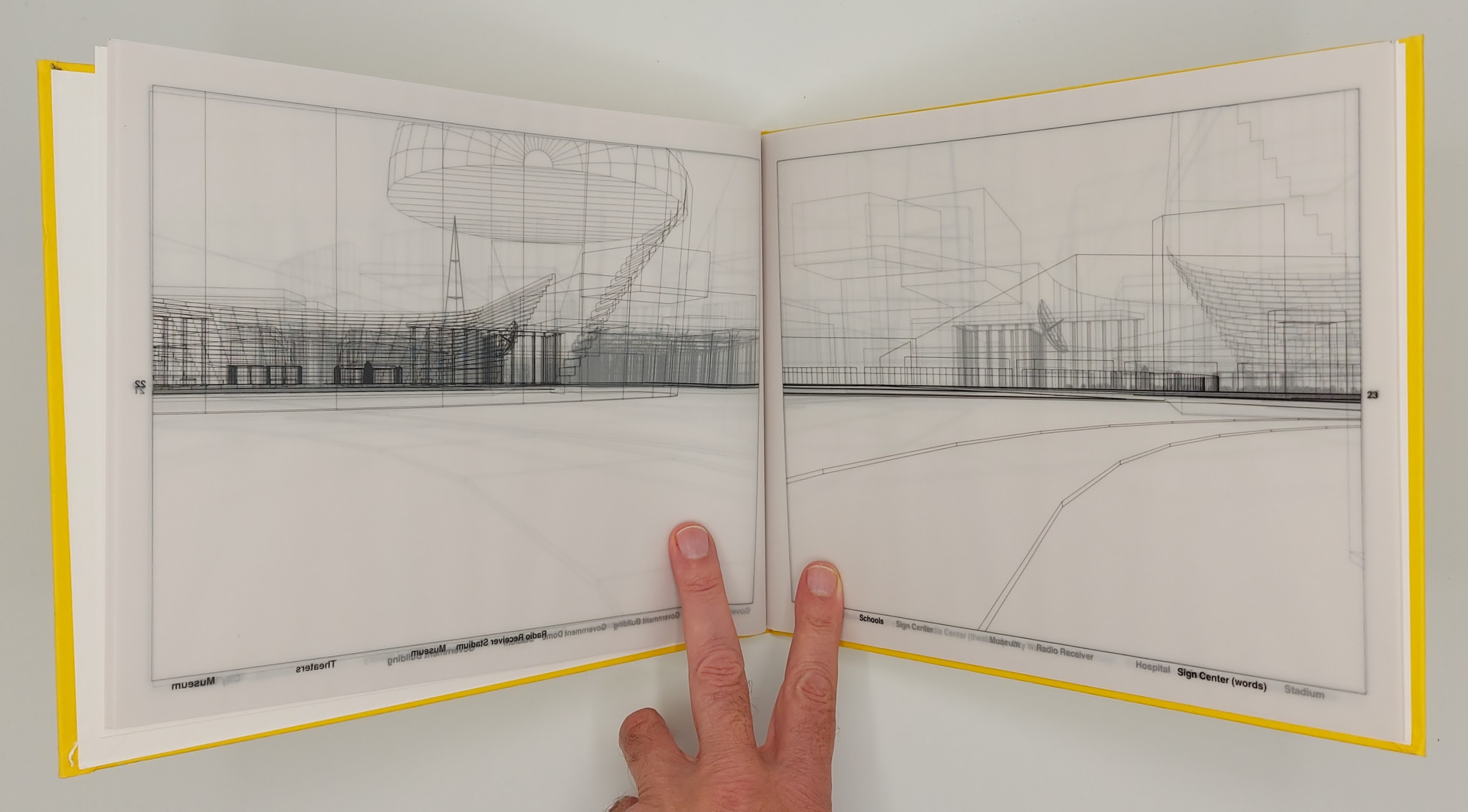 Imagine a city of the future. Here are the blue prints. Orwellian line drawings on tracing paper: thirty-sevenimages from a tour through an urban environment. Ref.3