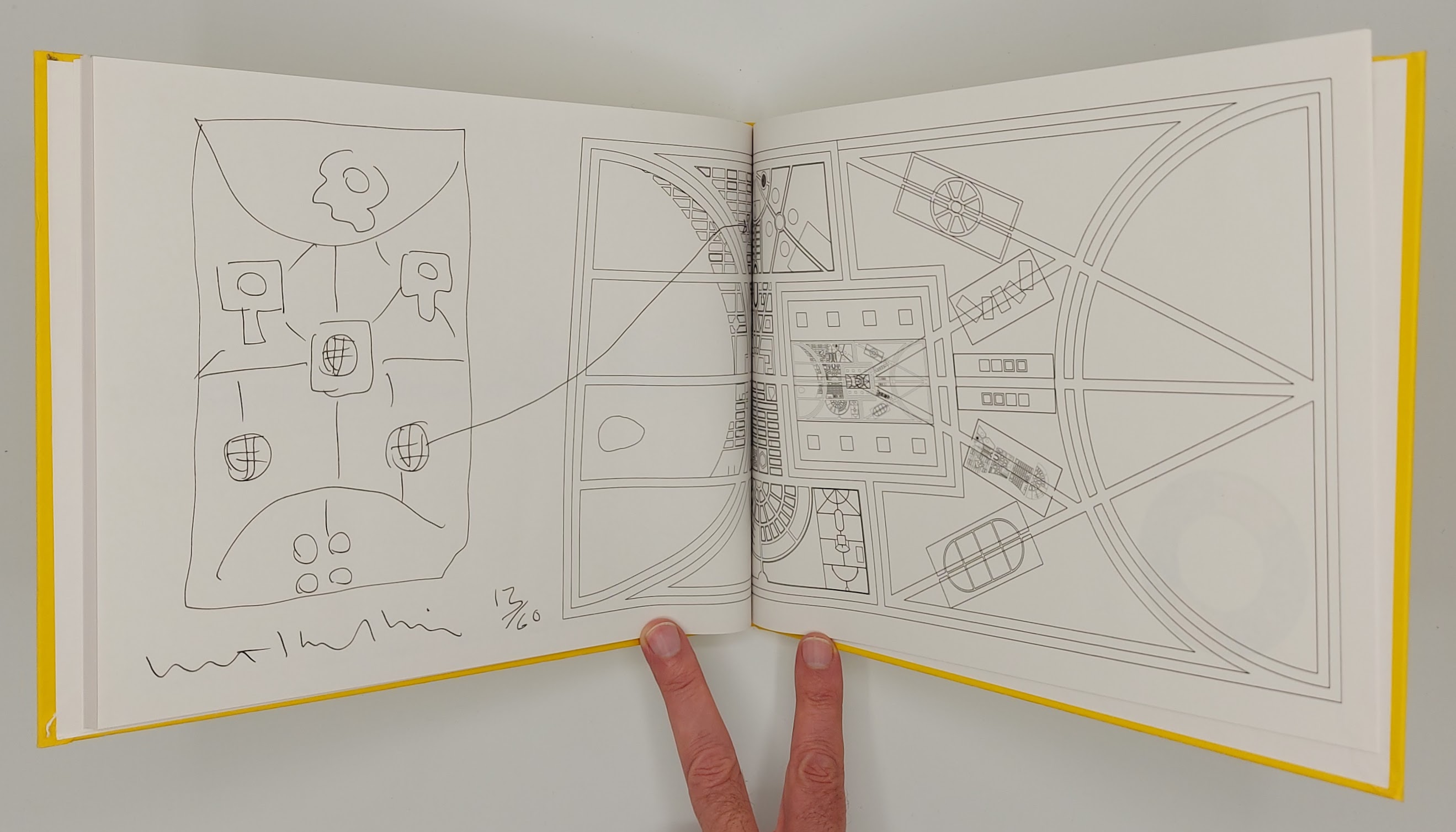 Matt Mullican Gent; Imschoot, uitgevers; 1992 IB-series, 92p., 21,7 x 28,2 cm, sewn, paper: tracing paper and offset, printing: 37 computerdrawings, black, yelllow, varnish Luxury edition of 60 copies, signed and numbered, hardcover + original drawing on the same page as numbering. Ref.1, Ref.2 Ex. 13/60 drawing on the same page as numbering Condition : new.